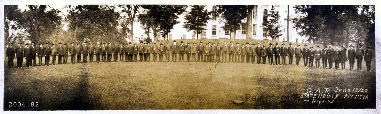 A b/w photograph of members of the G.A.R standing in front of the State House in Augusta in 1926.
