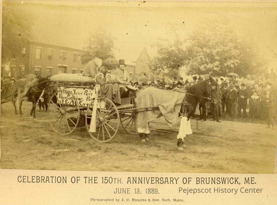 A sepia toned photo of a float for G.N. Crane in the 150th Anniversary parade in Brunswick. The float passes by a large crowd on an unidentified street. The sign on the side of the wagon appears to read: "To Ease Your Pain / Your Spring Beds / of G.N. Crane." Three people are riding on the float. There is a long brick building behind the float, same as the one picture in 1973.6.15, 1973.6.175 & 1973.6.20. The booklet describing the 150th Anniversary activities refers to this float as "G.W. Crane," but the sign clearly says "G.N. Crane." See also 1973.6.19. Dated 06/13/1889.Collection
