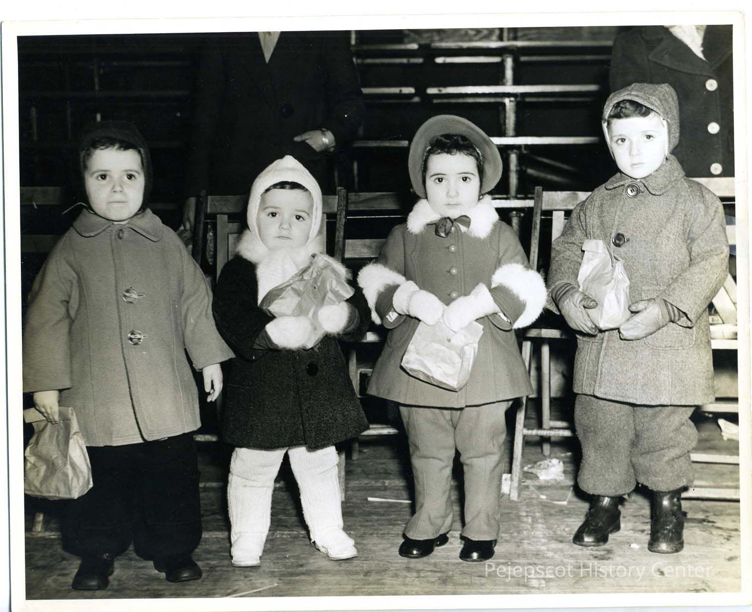 Roger, Fabienne, Eunice, and Placid (?) Gagnon children all dress in winter apparel. Undated