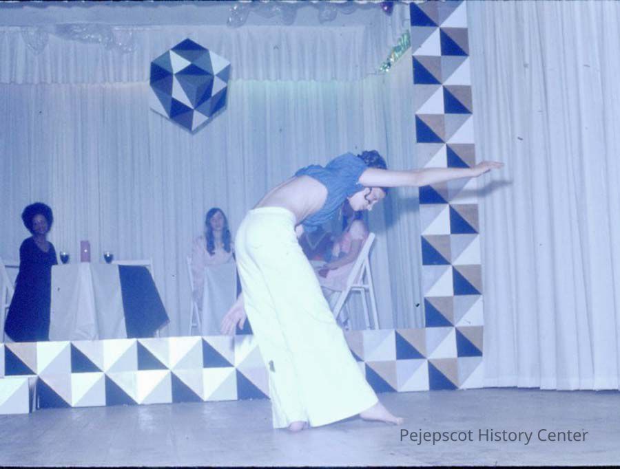 A 35 mm color slide of Gale Cowley performing in the 1973 Miss Teen Queen Pageant. Diana Johnson is the girl on the left. The slide is marked, "2." Undated