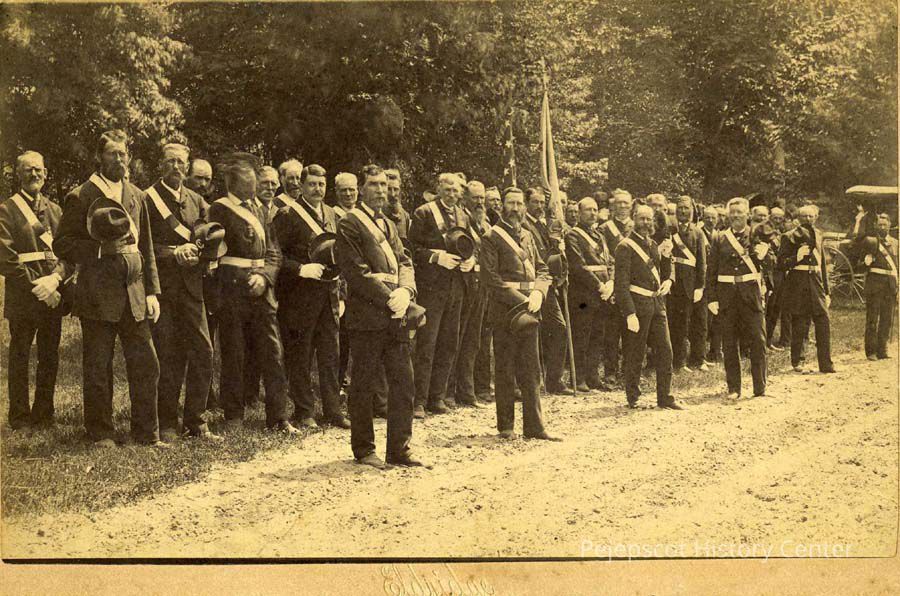 Sepia-toned photo of a group of GAR (Grand Army of the Republic) members. They wear white belts and sashes. No date.