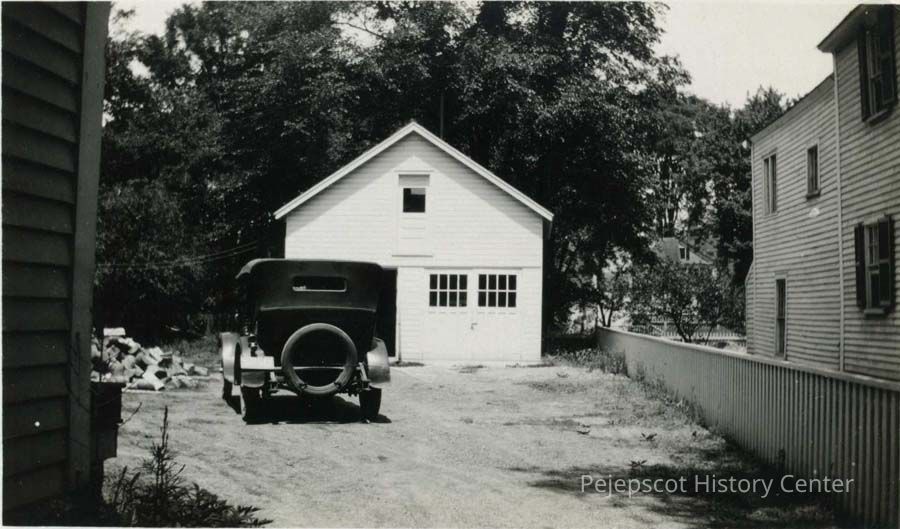 A black and white photograph of the garage at 10 Everett Street, Brunswick. A car is parked in front. The ell from the old Dennison house can be seen in the photograph.