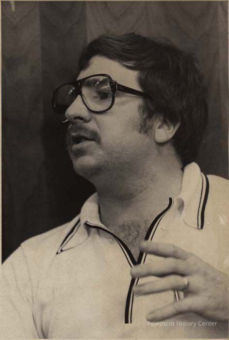 A black and white photograph of Gary Davis of Merrymeeting Hardware speaking at a Town Council meeting, was published in The Times Record in Brunswick, Maine, on 7/21 [unknown year]