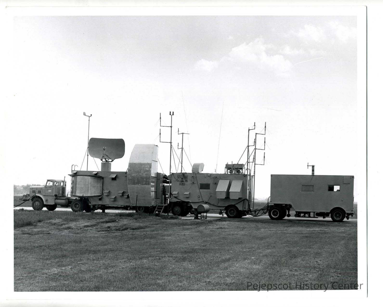 "The GCA Unit is comprised of three trailers, all connected to each other. The three piece unit is mobile, and may be driven to any runway to accommodate the approaching aircraft. The three radar screens on the front trailer send and receive their own signals, which locate the plane. By use of the five radar scopes inside the trailer, the operators can guide the plane to 'touchdown' point on the runways." Three stamps appear on the back "U.S NAVAL AIR STATION BRUNSWICK, MAINE", "OFFICIAL PHOTOGRAPH NOT TO BE USED FOR PUBLICATION UNLESS OFFICIALLY RELEASED", and "RELEASED IF PUBLISHED CREDIT MUST BE GIVEN AS FOLLOWS 'OFFICIAL PHOTOGRAPH U.S. NAVY'.'" UndatedLexicon