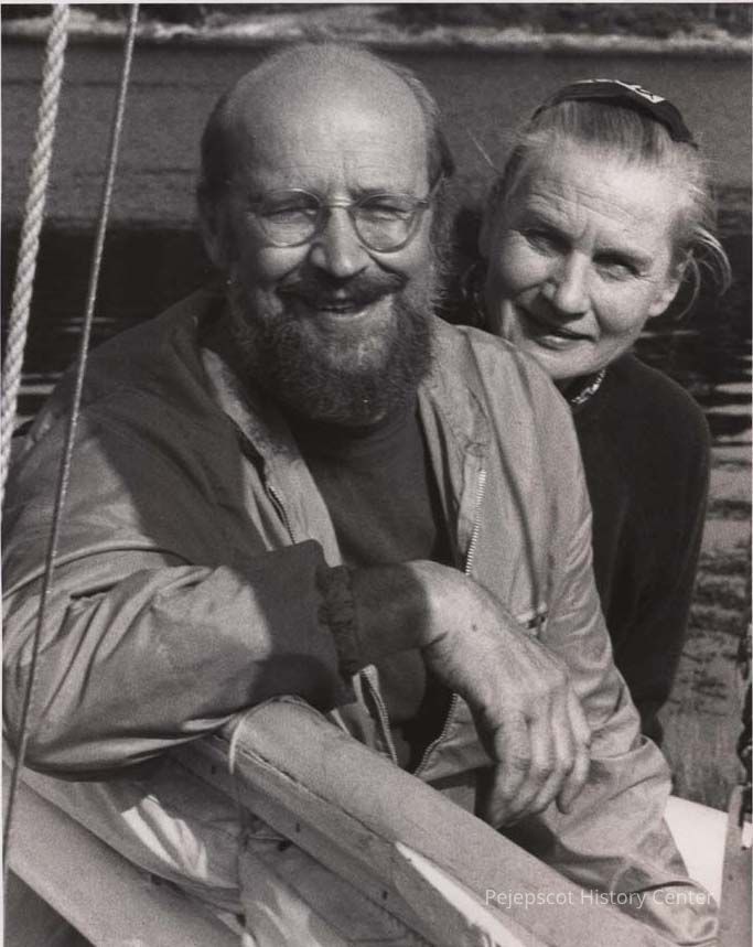 This black and white photograph of Gene and Bill Bonyun of Westport Island accompanied an advertisement for Heirloom Records announcing the publication of the couple's book "Full Hold & Splendid Passage" and the availability of their albums about the sea. The ad was published in The Bath-Brunswick Times Record in Brunswick, Maine, on 4/10/1970.