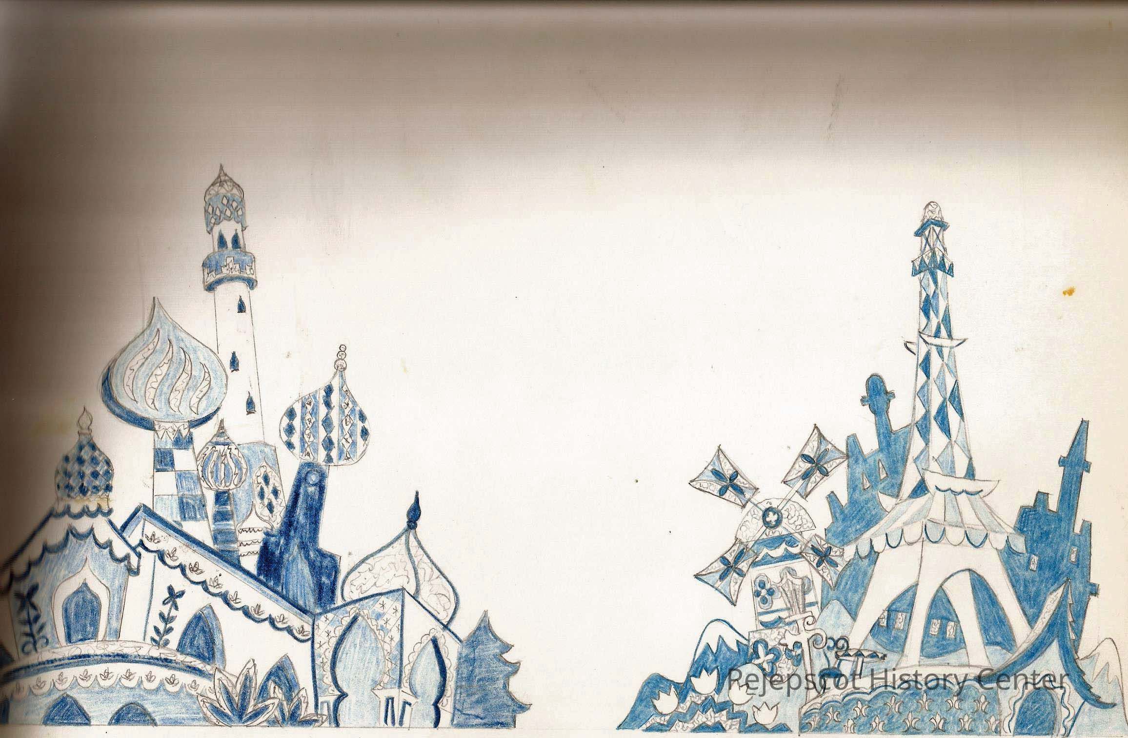 A blue and black drawing, attributed to Gene Gagne. The right side is marked "France - Holland - Switzerland. The left side to, "Russia - India - China".