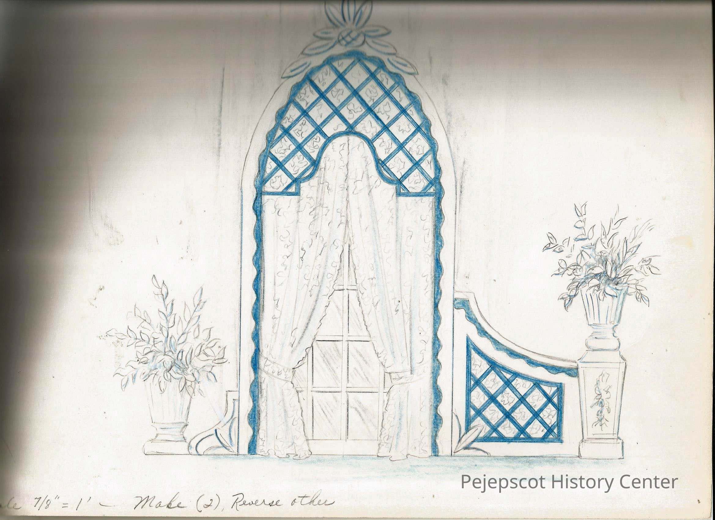 A blue and black (pencil) drawing of a doorway, design attributed to Gene Gagne, The instructions at the bottom say the scale is 7/8" = 1 foot. and to make two of them one the reverse of the other.