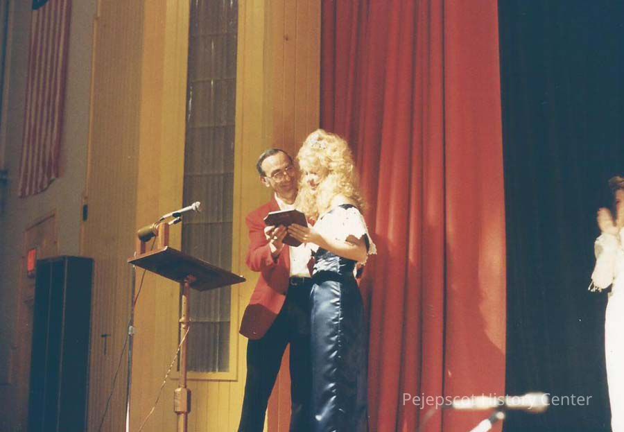 A color photograph of Gene Gagne presenting the scholarship plaque to Lisa Kelly.