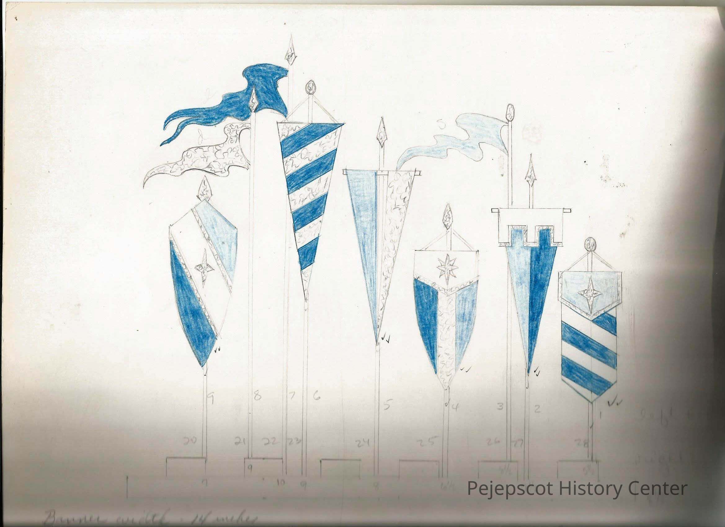 A blue and black drawing of a banner designed by Gene Gagne. Its height is 14 inches. and the width is 8 feet. the directions are, to make 2, the second one is to be reversed.