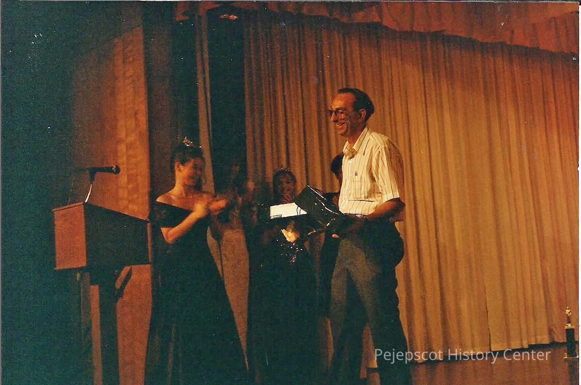 A colored photograph of 2 girls and Gene Gagne. Photographers # 5-16 CYO Sponsored
