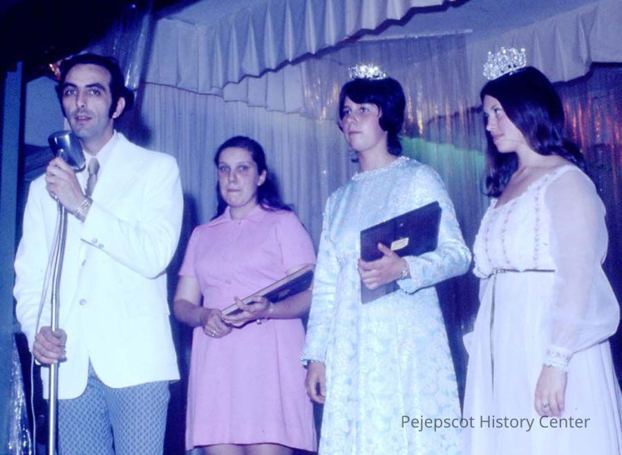 A 35 mm color slide of Gene Gagne, Barbara Theberge, Doris Bernier and Sharon Hinckley, two former winners of the pageant, during the 1973 Miss Teen Queen Pageant. The slide is marked, "6-85" and, "16." UndatedCollection
