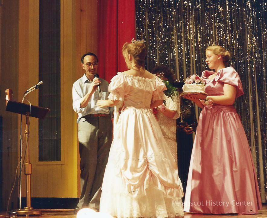 A color photograph of Gene Gagne giving Michele Byras the mike for a presentation. Photographers # 6-7 CYO sponsored