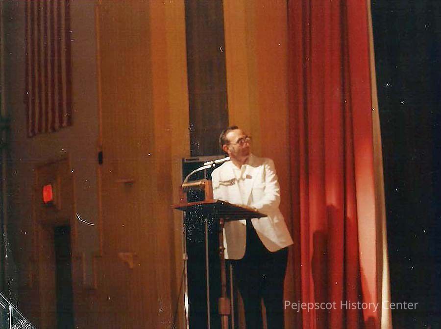 A color photograph of Gene Gagne pageant director addressing the audience.