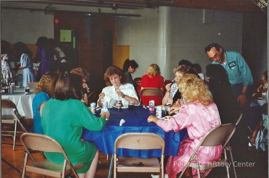 A color photograph of Gene Gagne speaking with Bob Towle at the Luncheon buffet.