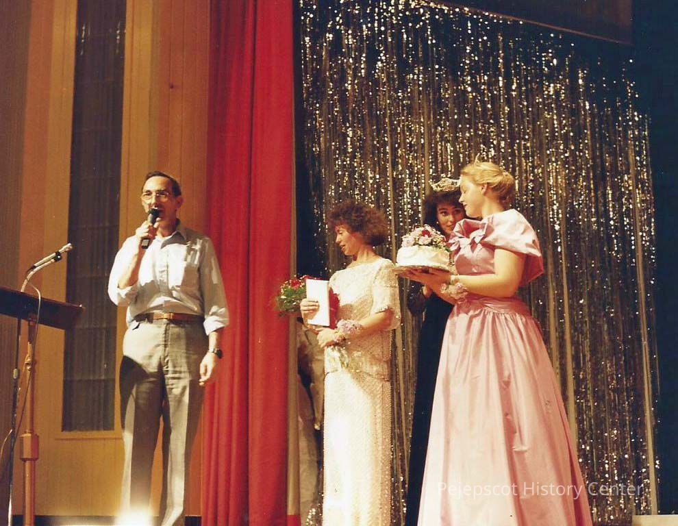 A color photograph of Gene Gagne telling the audience of Sharon's contribution to the pageant.