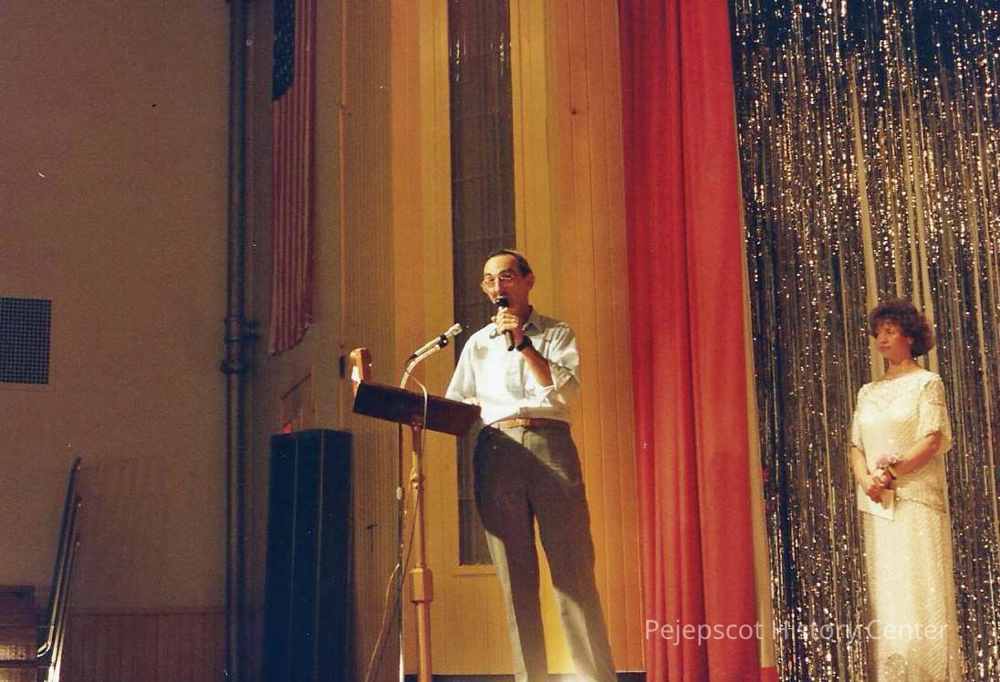 A color photograph of Gene Gagne thanking judges and supporters while Sharon looks on.