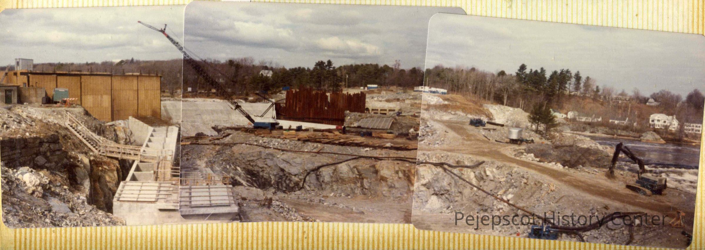 A color photo of the construction of the generating station. It was made by putting together 3 pictures to give a panoramic view. Undated
