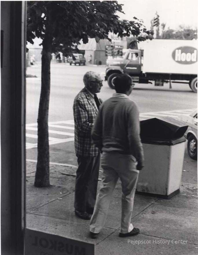 A B/W photograph of Geoffrey Stanwood on Maine Street. 9/1981