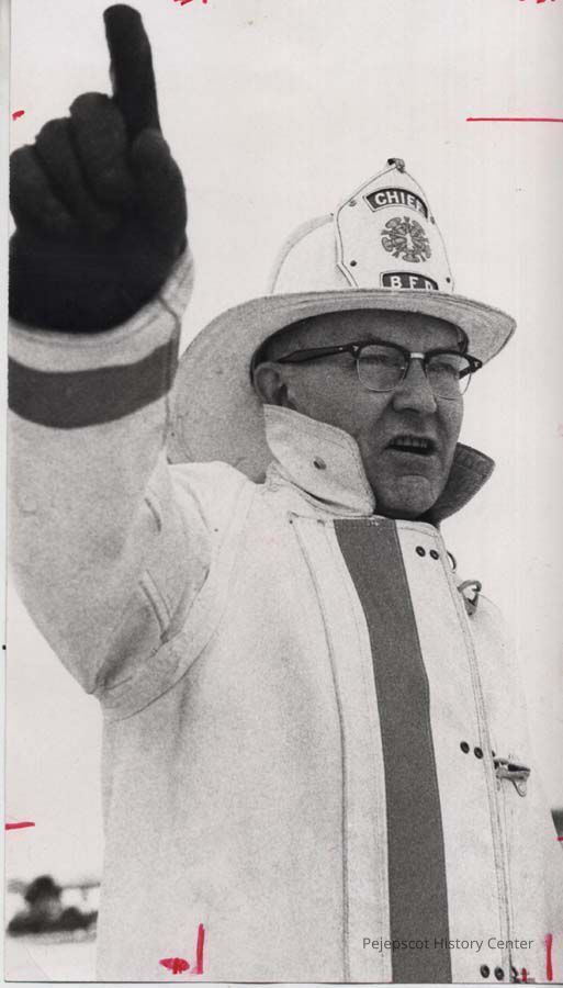 A black and white photo Brunswick Fire Chief George A. Gamache, appeared in a photo essay in The Brunswick Record in Brunswick, Maine, on 3/24/1966. The page of photos was "Oh Who Can Hold A Fire..." from William Shakespeare's Richard II. Gamache had been fire chief for 25 years.