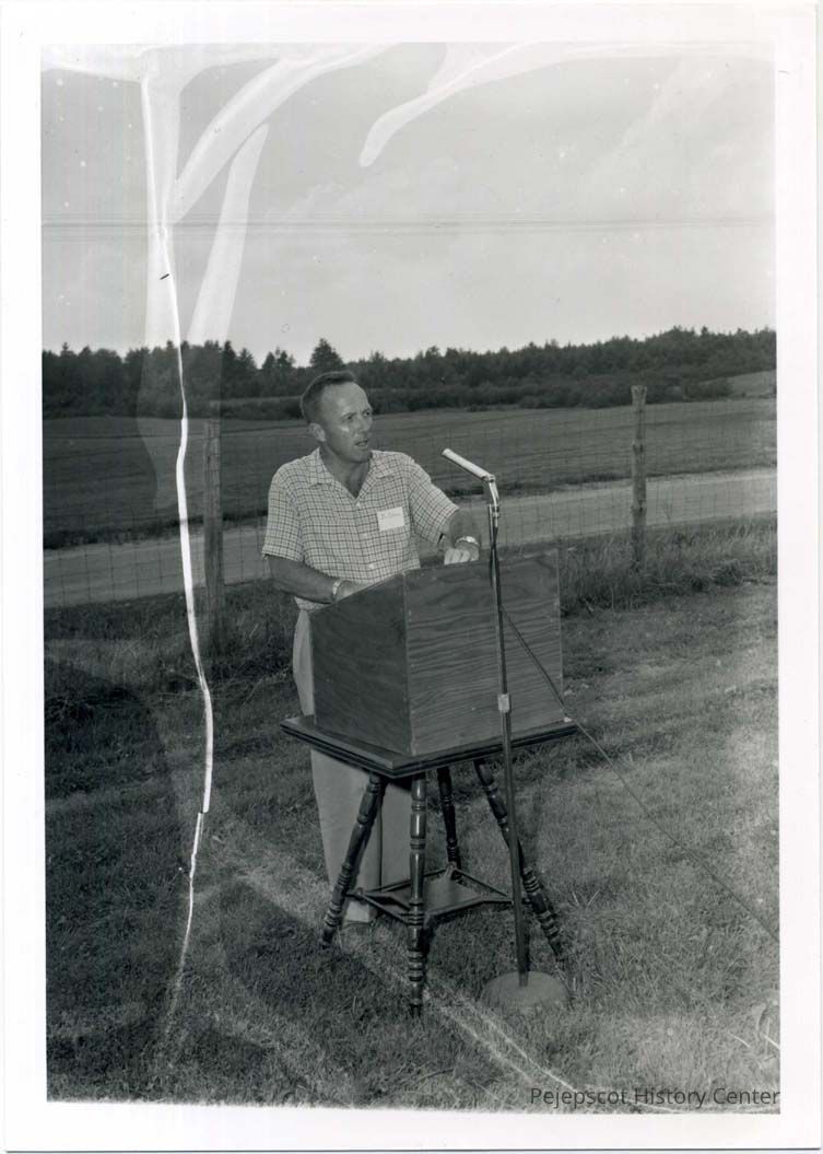 George E. Coleman stands behind a podium and mic to give a speech outside in July, 1956.
