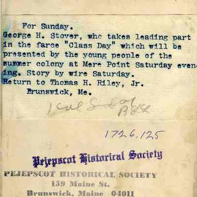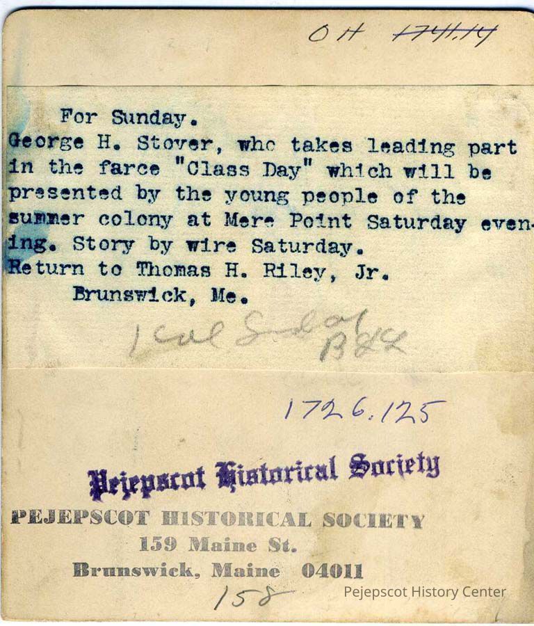George Hinkley Stover was born in Brunswick 13 April 1903, the son of Lemuel H. and Mary Ann Stover. He received his A.B. from Bowdoin College in 1903, graduating magna cum laude and was elected Phi Beta Kappa. He received his L.L.B. from Harvard in 1906 and practiced law in New York City from 1910 to 1917. He was Assistant Counsel to the NY State Public Service Commission from 1917 to 1929 and Chief Counsellor for the NY State Transit Commission, 1929 to 1943. He and his wife Edna Nichols Stover had two daughters, Mary Stover Curtiss and Allen Stover Horn. He died 23 May 1946. Photo not dated.