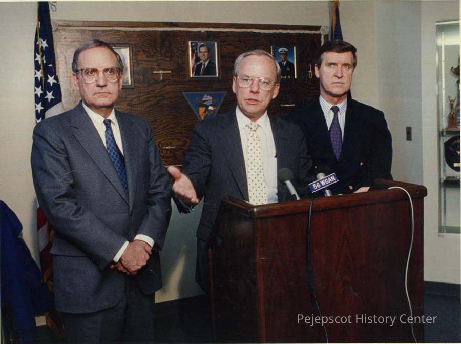 A color photograph of Senator George Mitchell of Maine, Secretary of the Navy Lawrence Garrett, and Senator William Cohen of Maine.