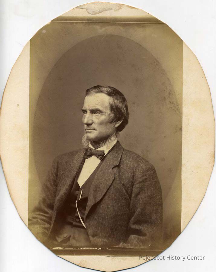 A B/W sepia toned cabinet photograph of George Rogers Skolfield, of Brunswick, ME. George was manager of Skolfield Brothers Shipyard. Gold trim in white oval mat. Dated c. 1860s.
