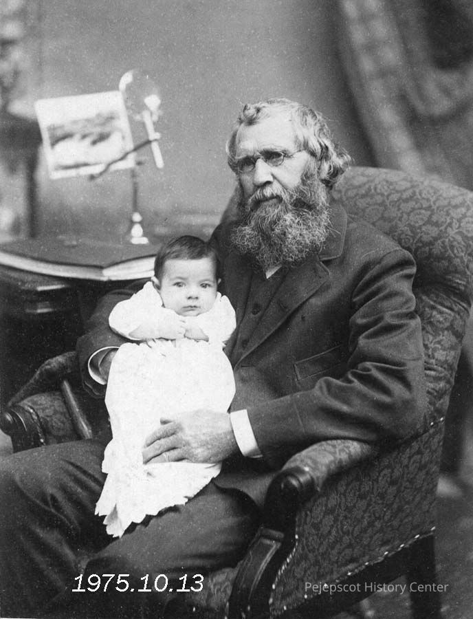 A black & white portrait photograph of George S. Dunning, a Master Shipbuilder at the Skolfield Yard with an unidentified baby. Undated.
