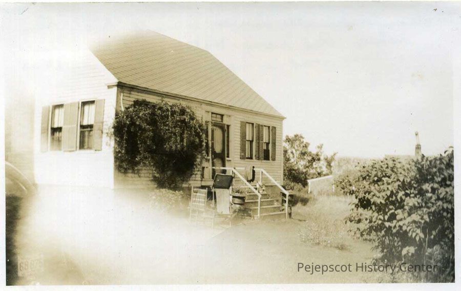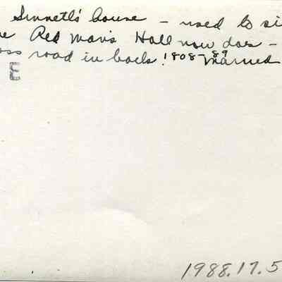 An undated black and white photograph of George Sinnett's house on Orr's Island. According to a written notation on the back of the photograph, it used to sit where the Redman's Hall now does, but was moved across the road in back. There are also dates on the back of the photograph, 1808 - 89 and married 1835 which likely refer to George Sinnett.