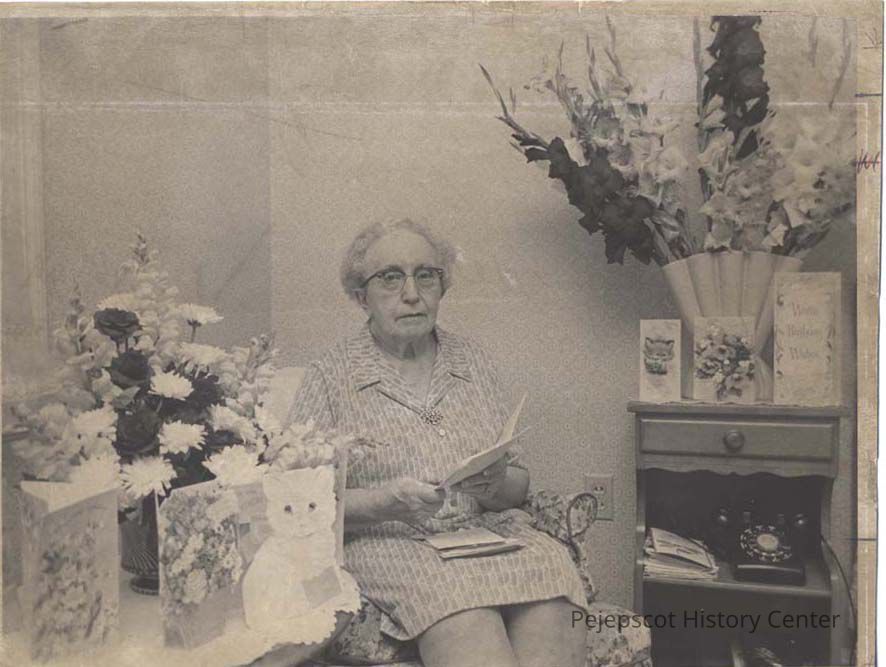 The photo was taken at the Stevens Home in Brunswick where "Miss Strout" celebrated her 80th birthday on August 11 with more than 220 cards, flowers, remembrances, and visits from friends and former students.