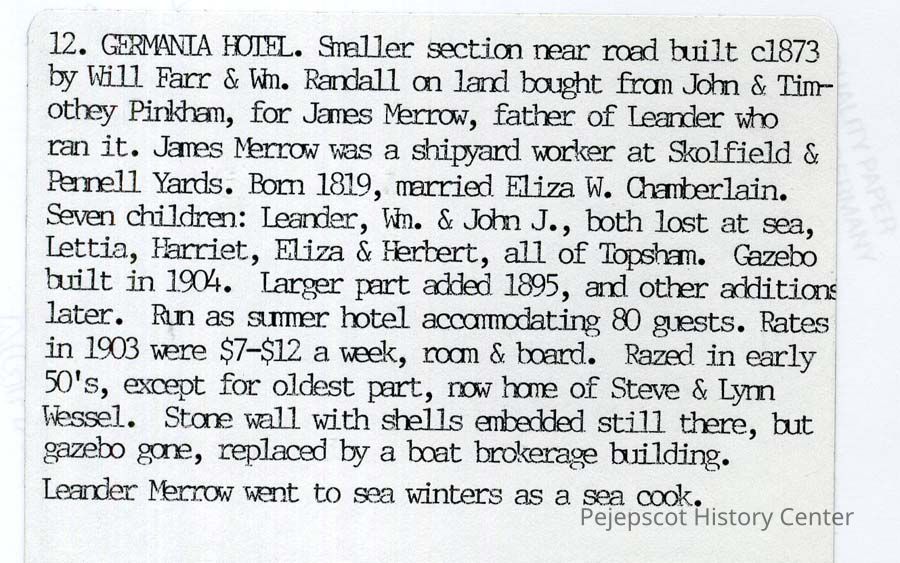 A copy print of the Germania Hotel. Built 1873 for James Merrow by will Farr and William Randall. See back of photo for more info.Collection
