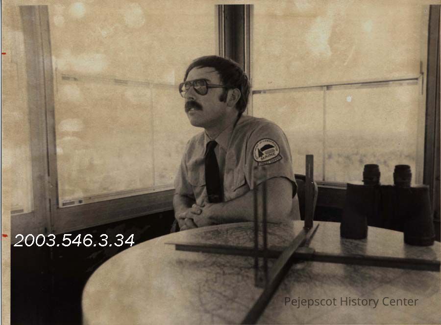 A black and white photograph shows Topsham Forest Watchman Gilbert Scott in the Mount Ararat Fire Tower. It was published in The Times Record in Brunswick, Maine, on 5/20/1980.