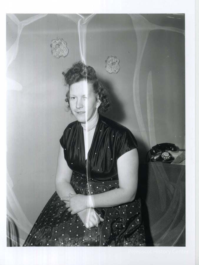 B/W photo of Mrs. Burton (Gelene) Gilliam sitting in front of a small table that has a telephone on it, 2/4/1956. She is the Baily Island Candidate for Tax Collector, Eastern Division.