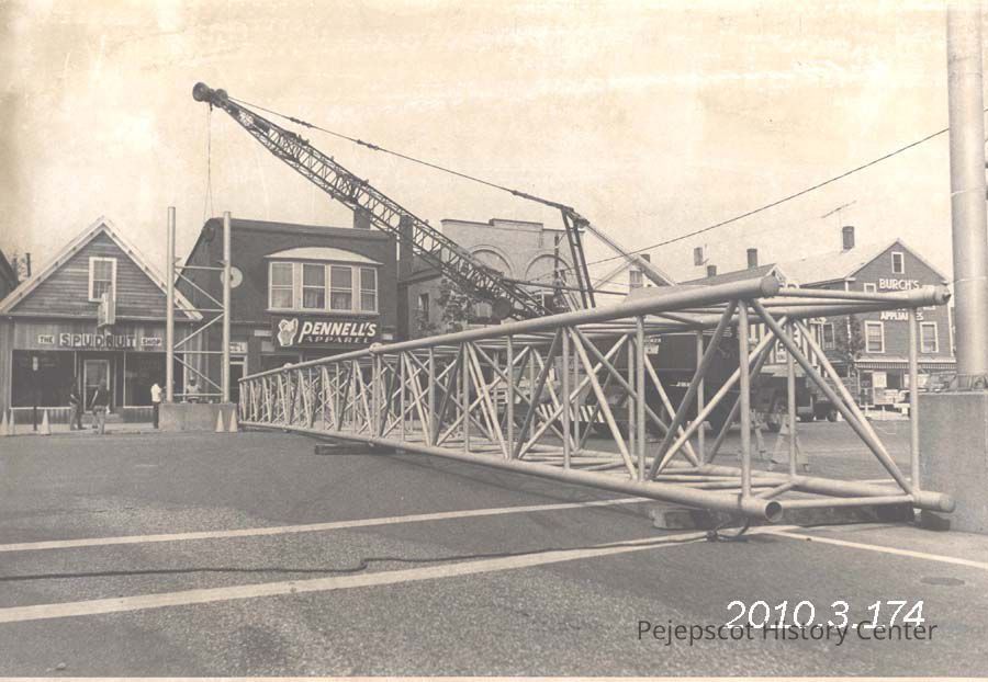A B/W photograph of a huge girder being removed from across Maine Street. It formerly supported overhead directional signs. The photo is looking across Maine Street at Pennell's Apparel store. Photo published 5/21/1975. Undated