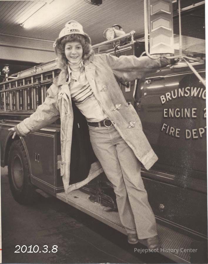 A B/W photograph of a young girl wearing a fireman's jacket and hat hanging off the side of a parked Brunswick fire truck. 03/23/1977
