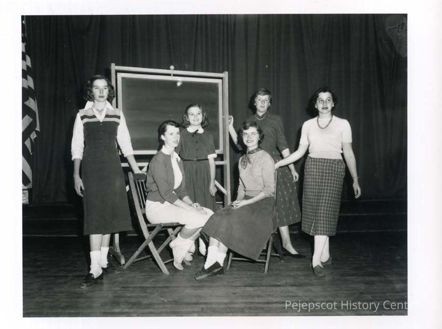 B/W photograph of six Girl Scout fashion models. From left to right: Ellen Daggett, Judy Morgan (seated), Stephanie Small, Sally Kennett (seated), Mary Atwood, and Roberta Glovesby. Photograph taken on 11/14/1954.Lexicon