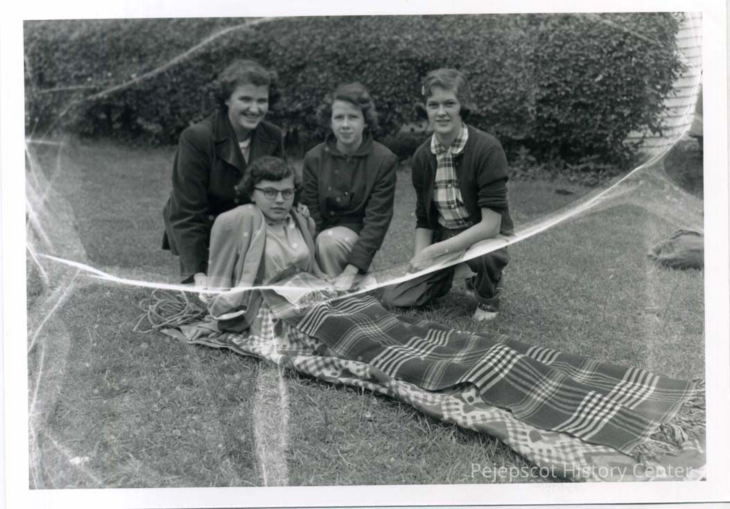 Four girl scouts one of whom is in a sleeping blanket.