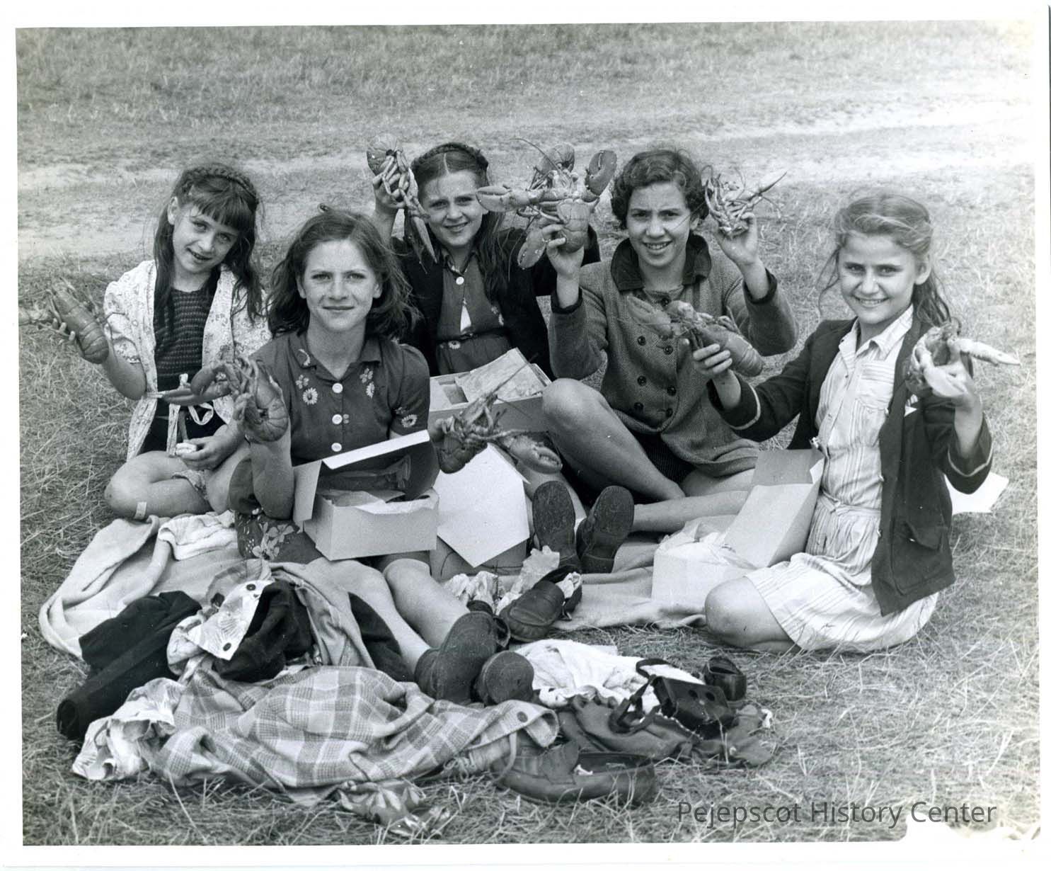 A picture taken at either a Verney Mill picnic or a Bath Iron Works picnic of five girls sitting on the grass holding lobsters. The two girls on the far right maybe ? Bergeron (#4) and Coulombe (#5). Undated