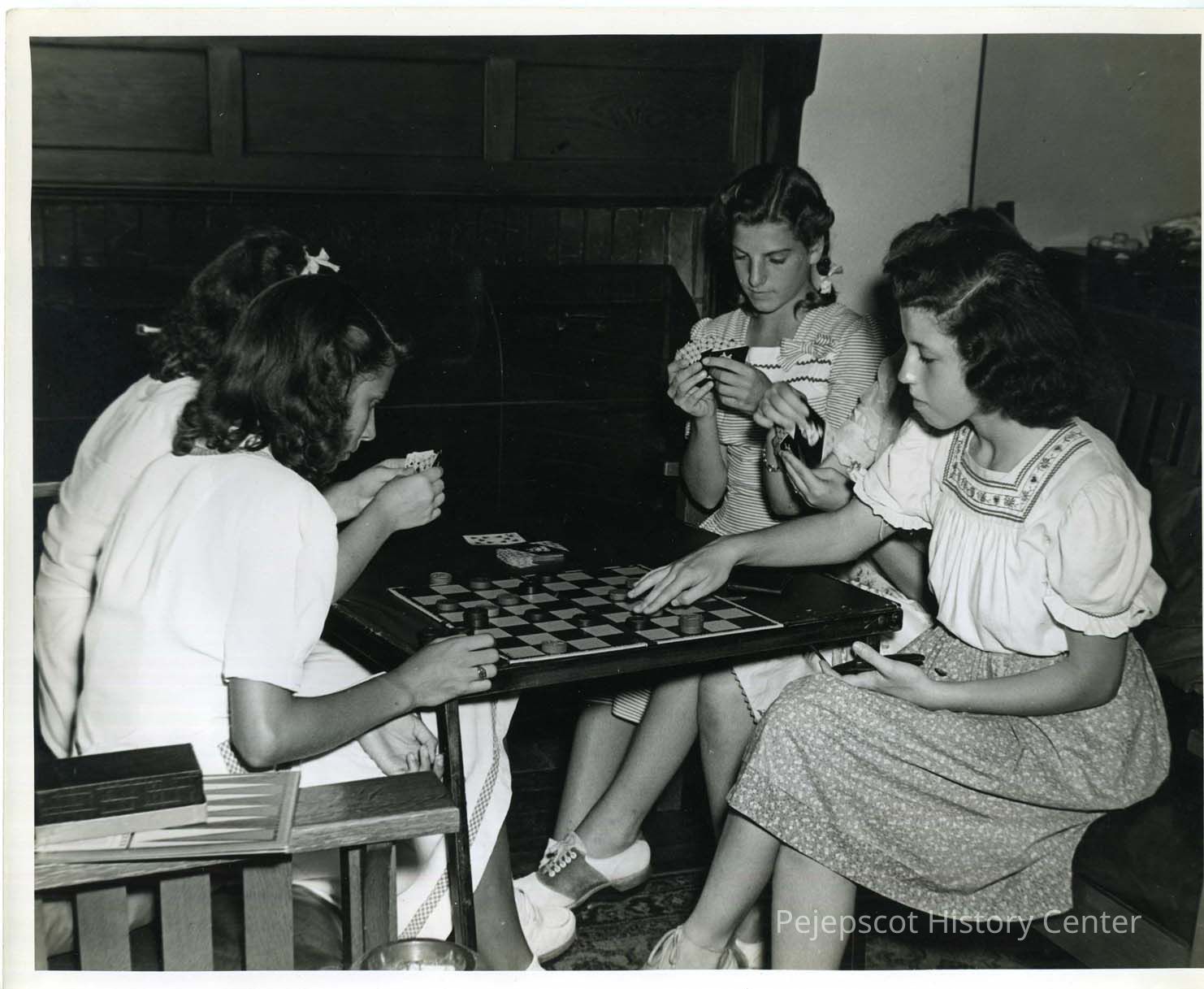 At the USO two girls are playing cards and two are playing checkers. On the right are Frances Dion and Jean LaCourse. Undated