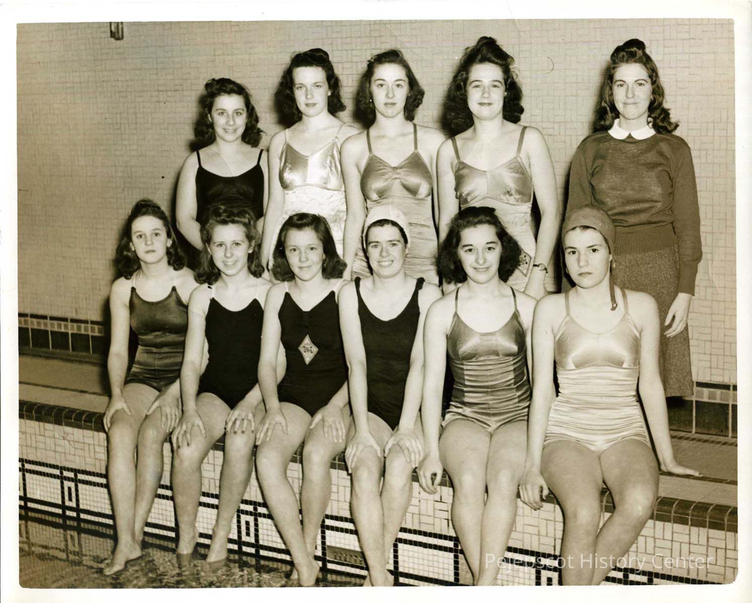 Brunswick High School Girls Swim Team c. 1940. Phyllis Wilson; Betty McLaughlin; Rachelle St. Pierre, Lorraine Charron; Lorraine Benoit; Eleanor Leslie; Prudence Casey; Barbara Baldwin; Betty Magee, Manager.