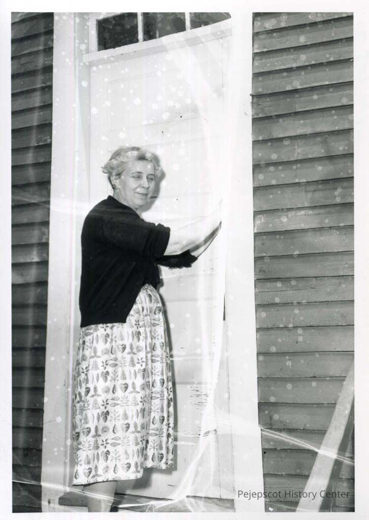 Gladys Wilson, long time Bunganuc School teacher, stands at a door.