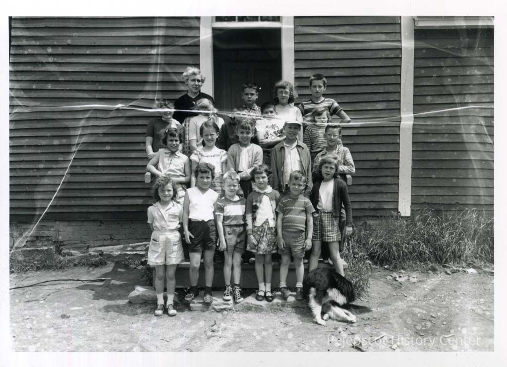 Gladys Wilson, teacher, stands with her class in front of the Bunganuc School.
