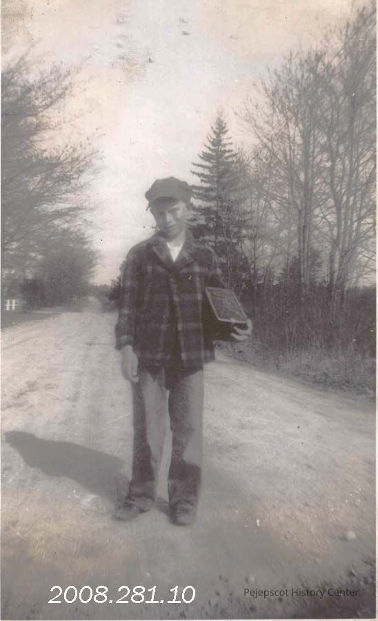A B/W photo of Glenn Gott, showing a young boy holding a box. Marked on the back, "Jun 16 1947 Mass."