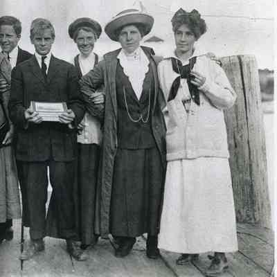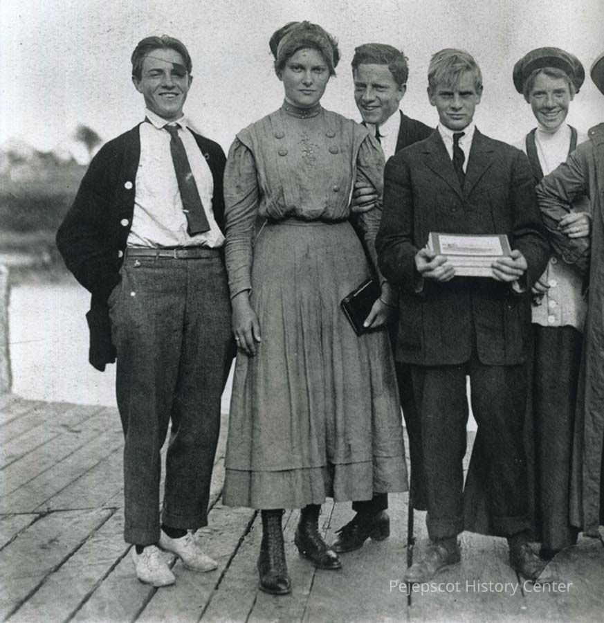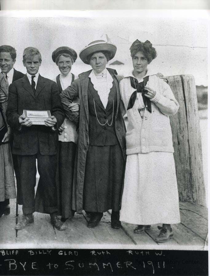 B/W photo of a group of unknown people at Bailey Island, Harpswell, ME, titled "Good bye to summer 1911". 1911.