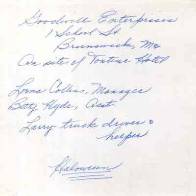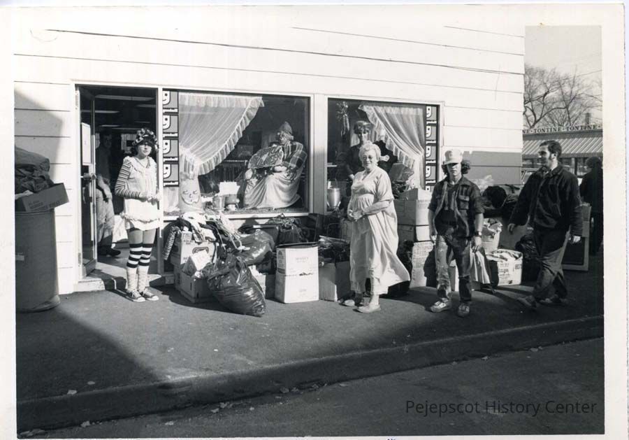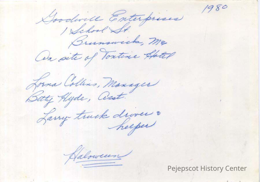 A black and white photograph of employees of Goodwill Enterprises, located at 1 School Street, Brunswick, dressed up for Halloween in 1980. The back of the photograph indicates the employees are Lorna Collins, Manager, Betty Hyde, Asst., Larry - truck driver and helper. The back of the photograph also indicates that the business was on the site of the Tontine Hotel.Lexicon