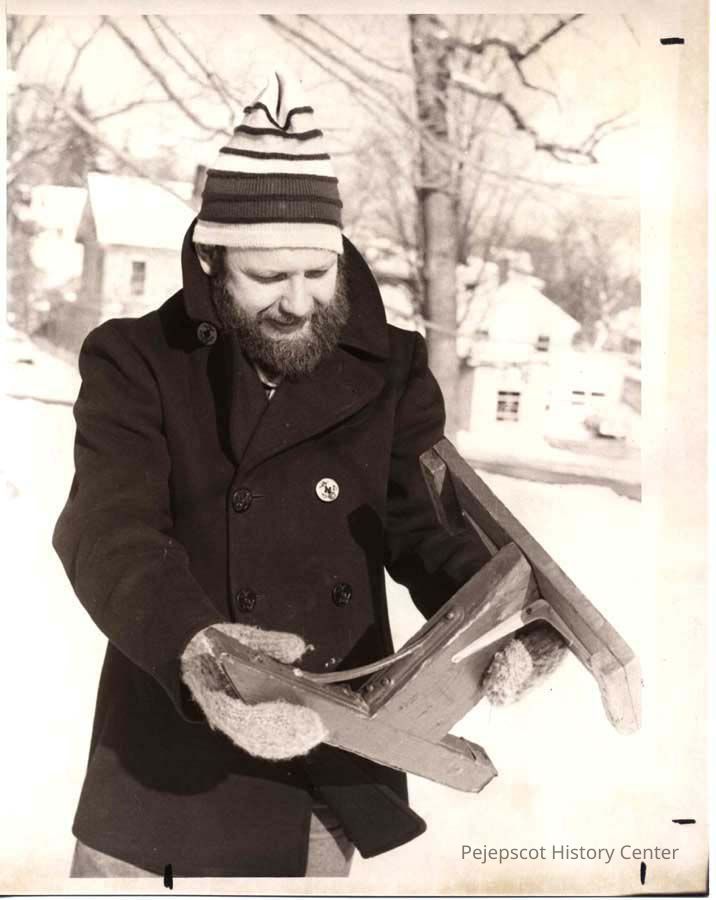 A black and white photo of Gordon Struble hold a skiing device that you sit on was published in The Times Record in Brunswick, Maine, on 1/28/1980.