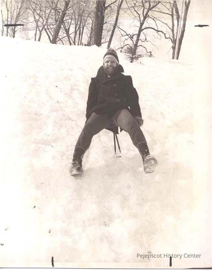 A black and white photo of Gordon Struble using the device shown in 2003.546.3.565. This photo was published in The Times Record in Brunswick, Maine, on 1/28/1980.