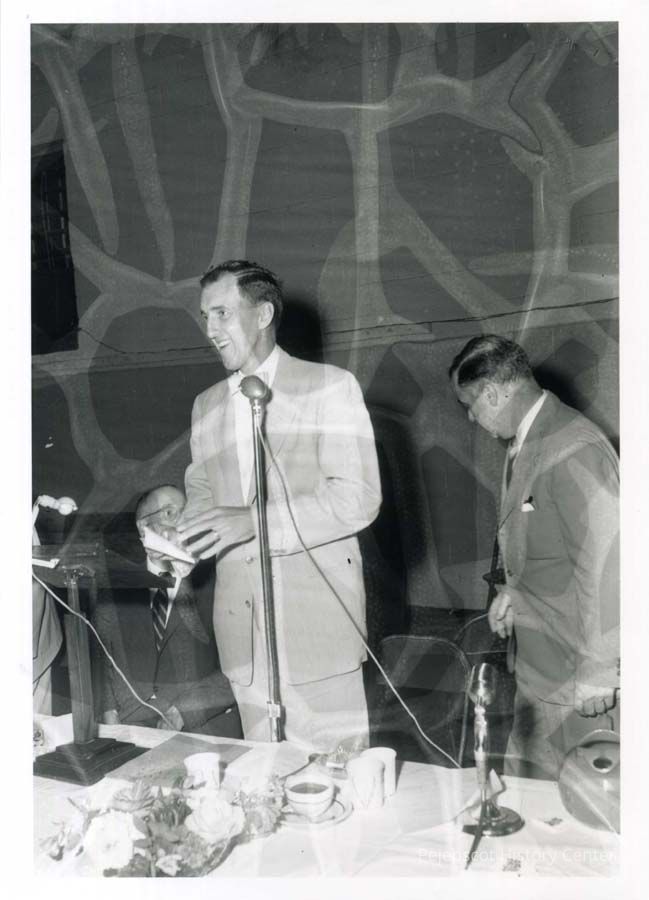 Black and white photograph of Gov. Edmund S. Muskie speaking at a Brunswick Chamber of Commerce banquet 7/3/55. next to Jim Black