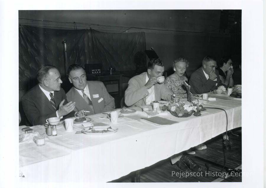 B/W photo of the head table at a Brunswick Chamber of Commerce kick-off banquet. Left to Right are Herbert R. Browne, T. James Black, Gov. Ed Muskie, Mrs. T. James Black, Adam Walsh, Mrs. Merle Norton, and Carl Briggs.Lexicon