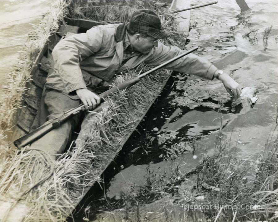 A photo of Governor Horace A. Hildreth of Maine duck hunting at Merrymeeting Bay. He is picking up a duck he has shot. Undated